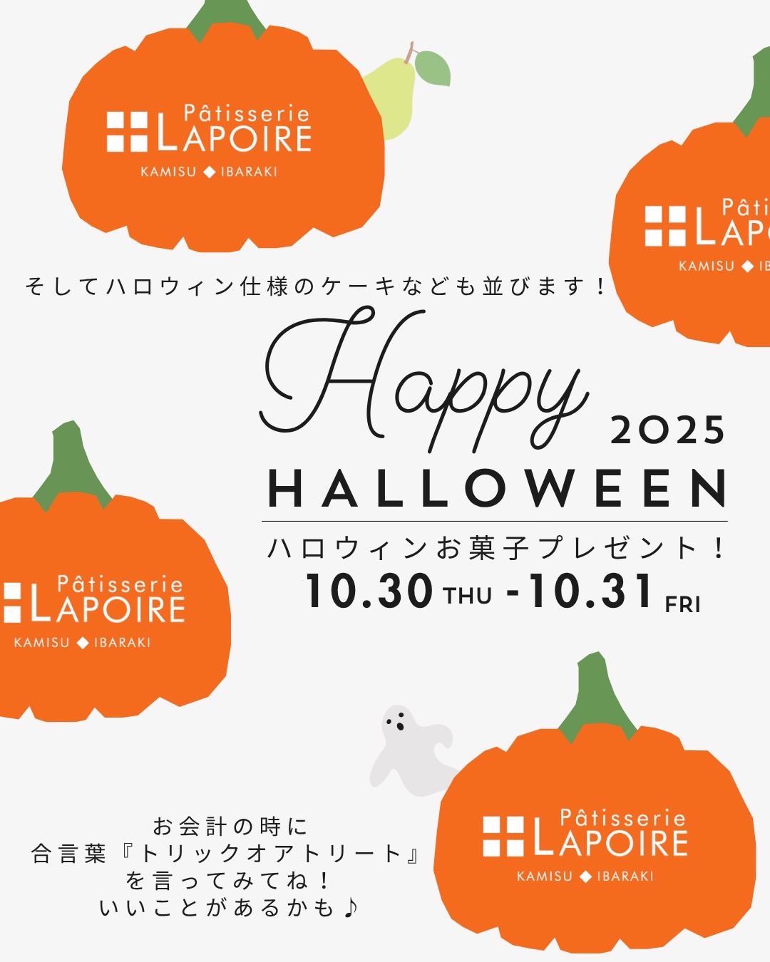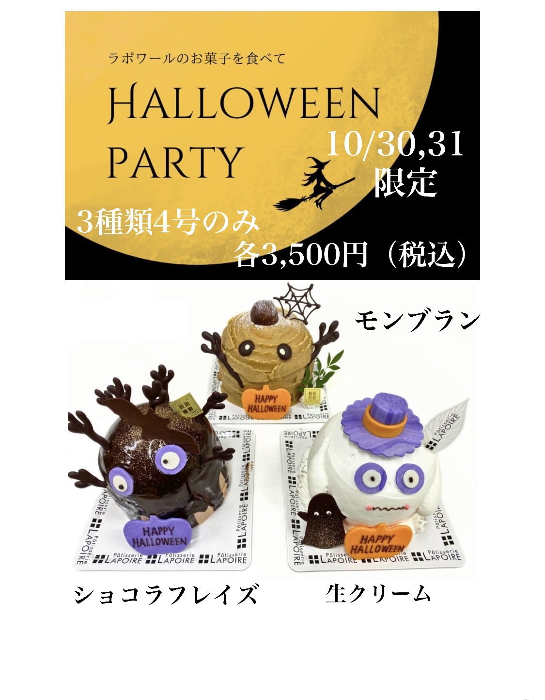 ハロウィンのイベントを行いますハロウィン仕様のケーキも並びます、数に限りがありますのでご了承ください。